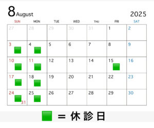 2025.07.25 2025年8月の営業カレンダー 【2025年8月の開院カレンダー】 8月15日(金) 夏季休業をいただきます 【休診日の対応について】 対応可能日時は「WEB予約」にてご確認ください。 【お問い合わせについて】 お電話(営業時間内)・本サイトの「お問い合わせ」フォーム・インスタグラムDM・LINE(連絡先は院内のみで公開)にて承ります。 宜しくお願いいたします。 前のページへ 一覧へ戻る 次のページへ