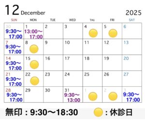 年内~2026年1月4日の日曜日は振替営業いたします。